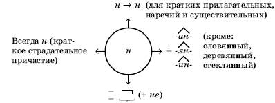 Затем по мере выяснения формул (правил написания н в различных частях речи) учитель на глазах у ребят постепенно вычерчивает схему на доске: сначала появляется центр схемы (кружок с буквой н), потом по мере формулирования правил каждое из них графически фиксируется в виде формулы и занимает соответствующее место. Исключения из правил указываются в скобках.